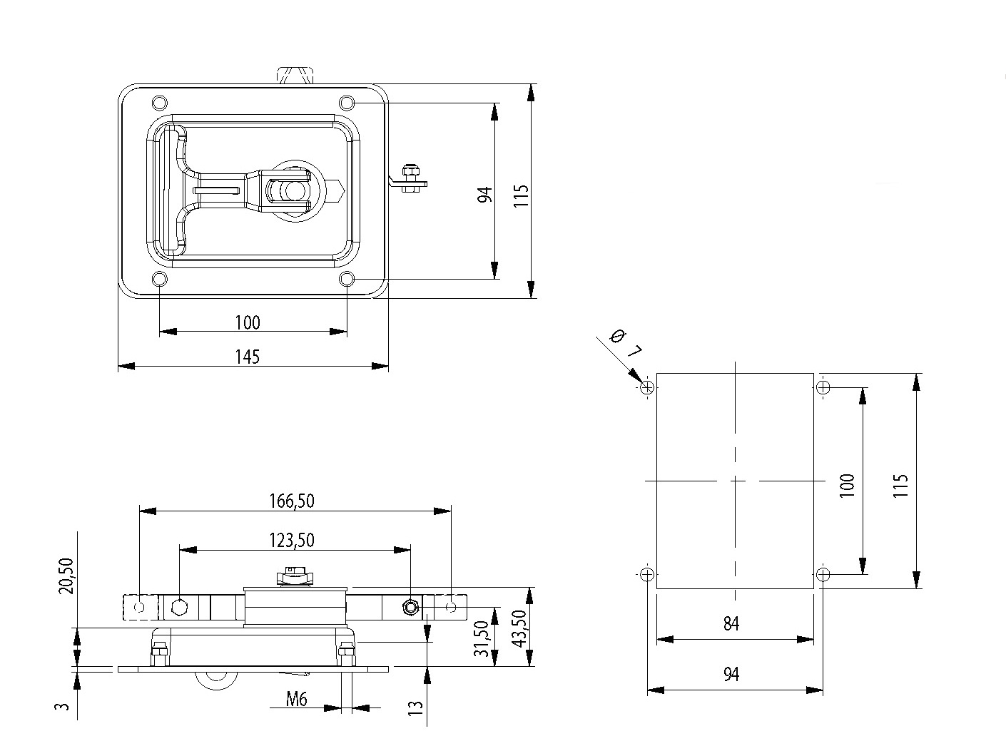 齐平式T形把手和挂锁装置配套使用,用于控制机械装置,可垂直或水平安装。 材料: 锁体:钢,黑色涂层。 把手:锌铸件,镀铬。 挂锁环:304不锈钢。 连杆门闩:锌。 连杆:钢,镀锌。 适配器:锌,镀锌。