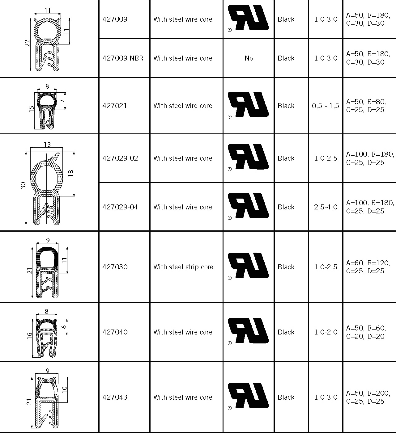 自动夹紧的密封条由一个黑色EPDM橡胶承载体和一个泡棉唇和/或管制成。集成钢绳心或钢丝心 (见表格)。编号为427009 NBR是由丁腈橡胶制成。