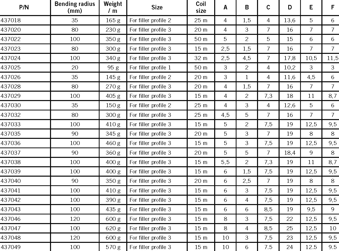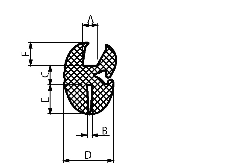 视窗密封条更容易且更牢固地去固定窗户,门板等。 和页面4-200的填充条一起使用。这种玻璃密封条如图显示,有一个朝上方的玻璃A槽和一个朝下方的框架B槽。 下表列出的弯曲半径是实际的最小弯曲半径。 材料: EPDM,黑色。 测量的尺寸从A列到F列,量度都为mm。